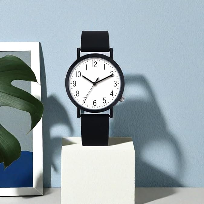 • Classic Design: This analog watch features a sleek, minimalist design with a round white dial and black Arabic numerals for easy time-telling.